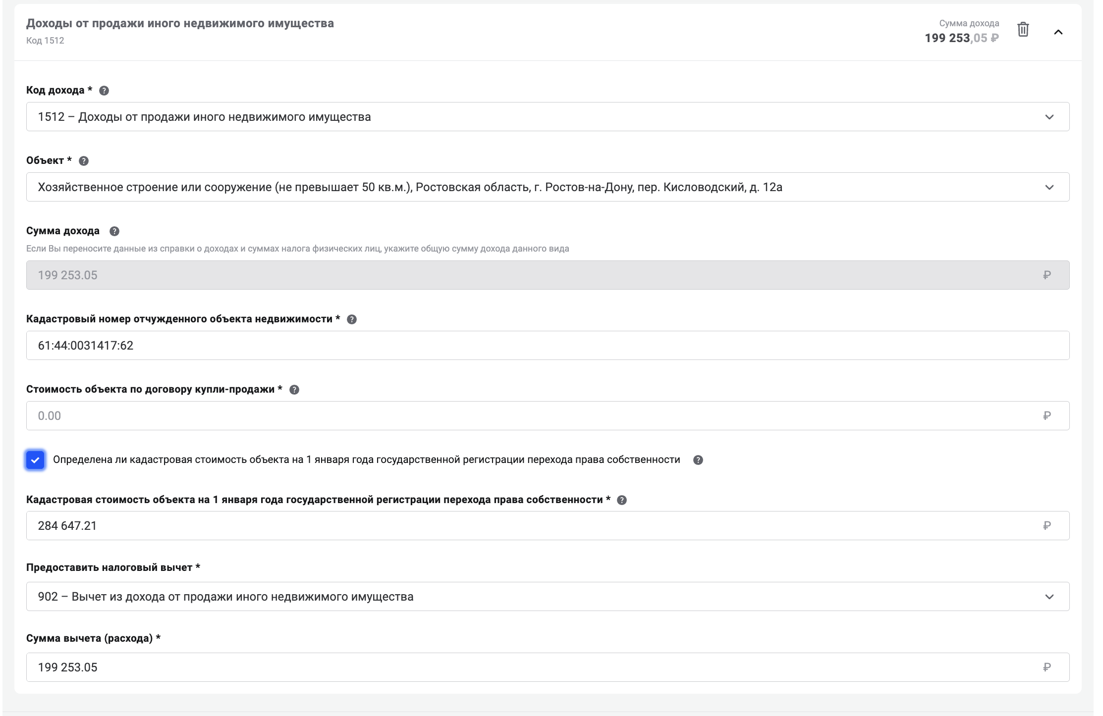 В декабре 2025 года совершил сделку, продал за 1100000 руб, столько и прописано в договоре купли-продажи.