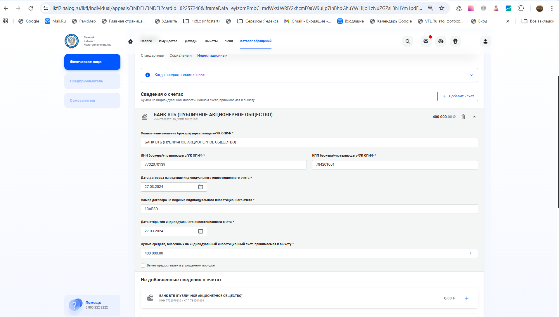 Указал расходы для получения стандартного вычета на детей, социального вычета за 2025 год (лечение и фитнес) и инвестиционного вычета. Однако сумма к возврату оказывается меньше на 14 000 (должно быть около 68000, а отражается 54000).