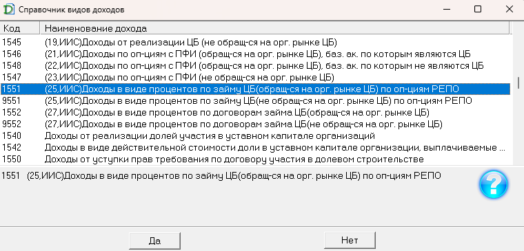 Таким образом, коды дохода 1539 и 1553 исключены из расчета, поскольку нет возможности автоматически определить к каким ценным бумагам относится полученный доход. В зависимости вида ценных бумаг данные об этом доходе и соответствующем расходе вводиться в программу "Декларация":