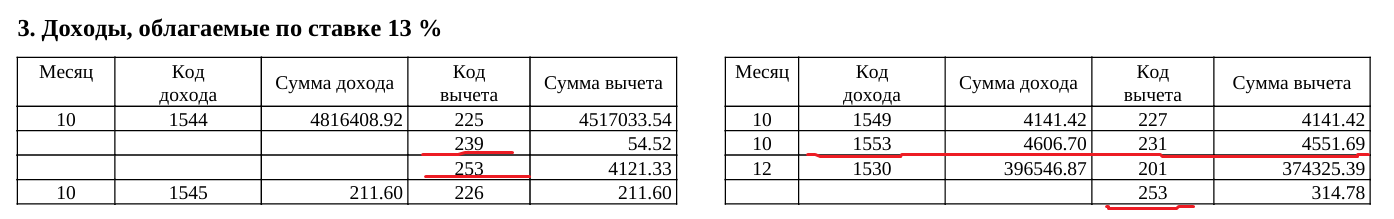 2) для дохода по коду 1553 с помощью кода дохода 1544 или 1545 с кодами вычета 233 или 234 соответственно.