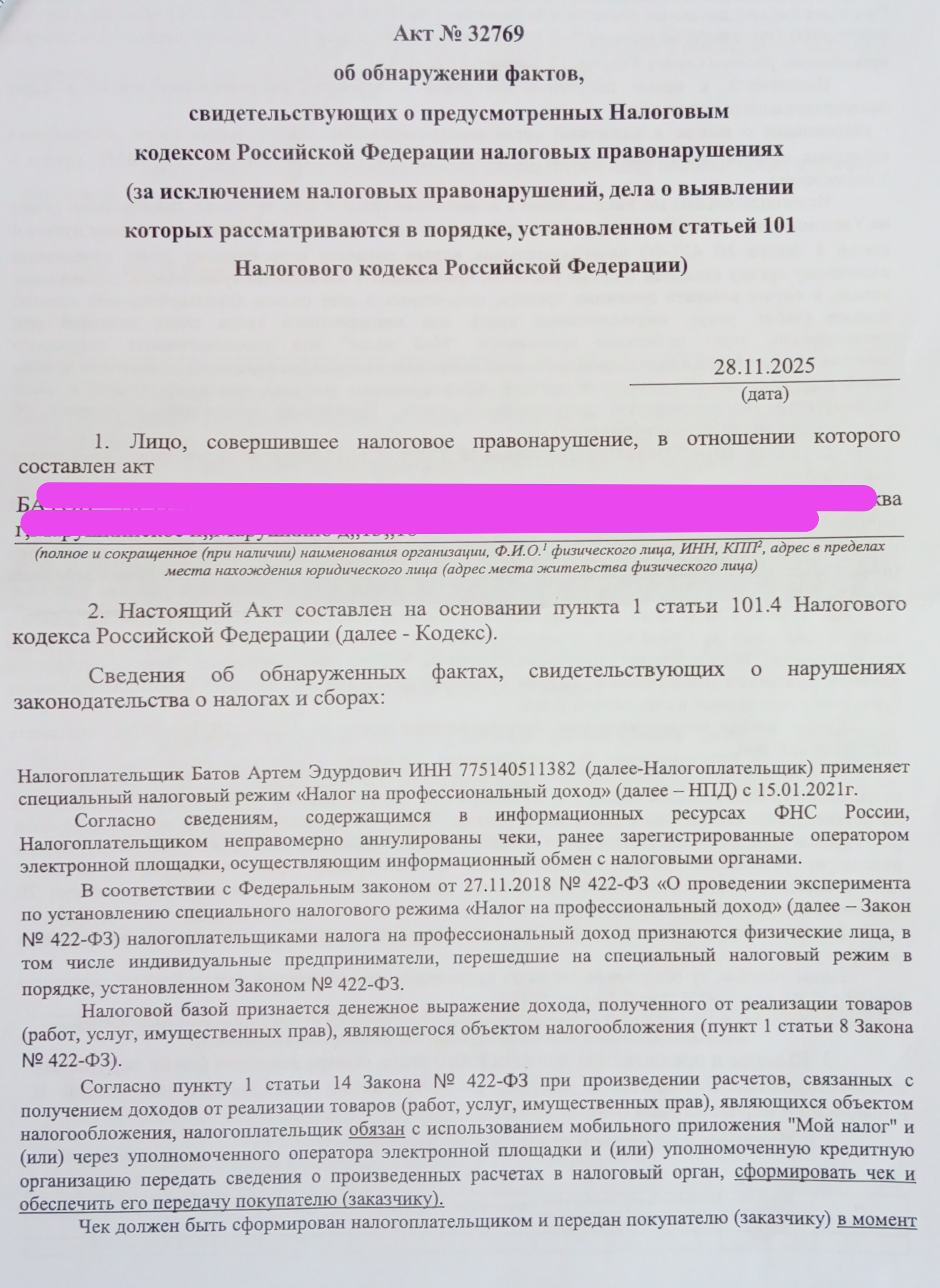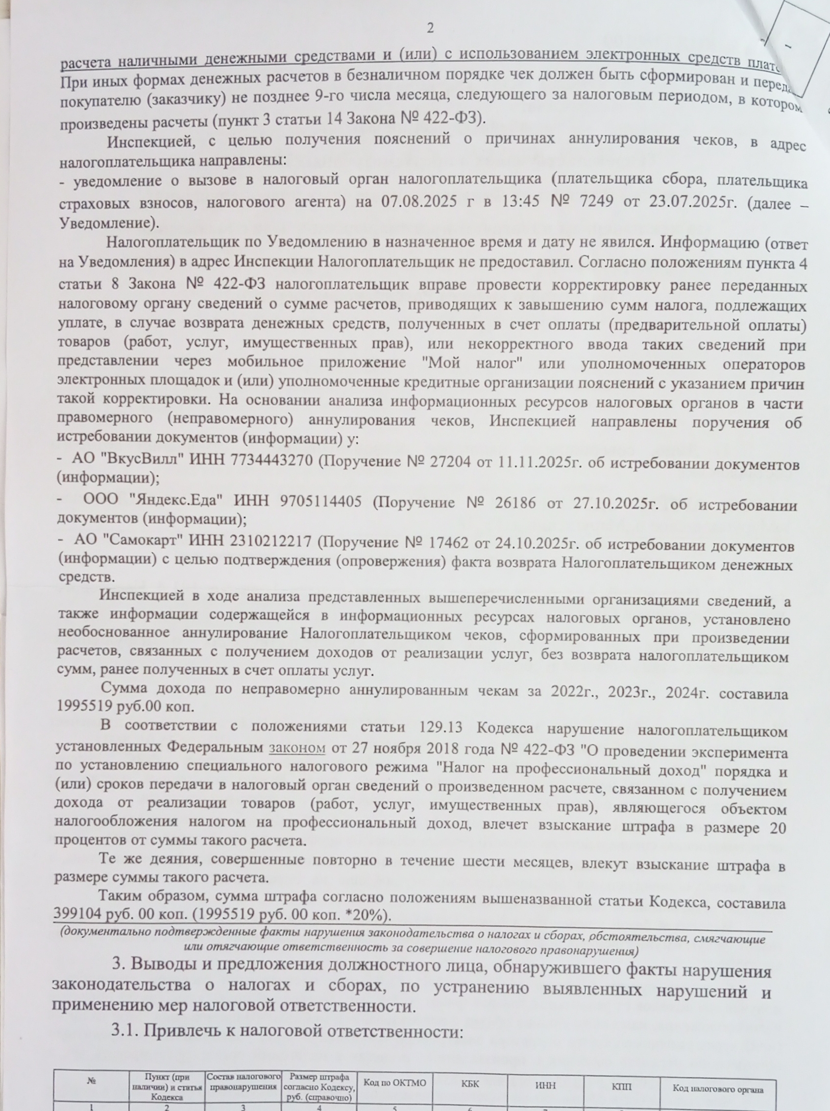 27.12.2025 г получен Акт от 28.11.2025г. от налоговой в отношении самозанятого по ч.1 ст. 129.13 НК РФ. Сумма дохода по неправомерно аннулированным чекам за 2022, 2023,2024 гг. составила 2 миллиона рублей. Таким образом сумма штрафа по данным ФНС составила 400 тыс.рублей.