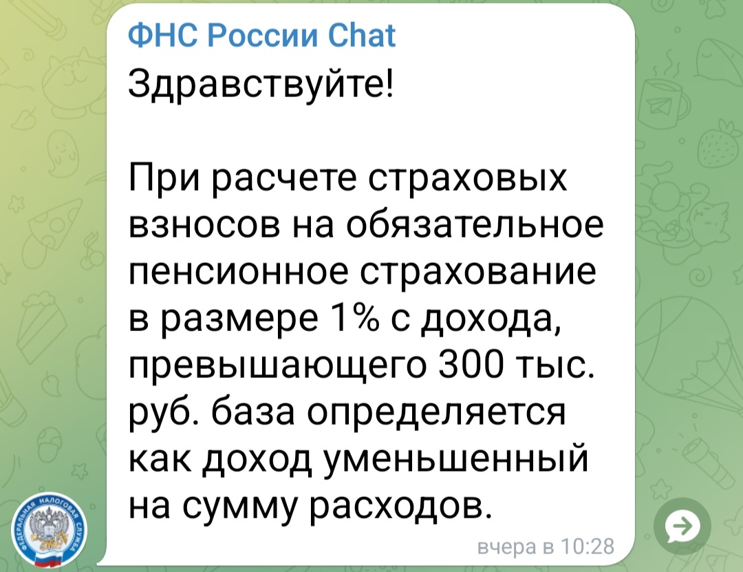 Здравствуйте! Ранее этот вопрос вызывал споры, но сейчас налоговые органы подтверждают, что ИП на УСН "доходы минус расходы" рассчитывают базу для 1% как разницу между доходами и расходами. Скрин с таким ответом из чата ФНС в ТГ-канале прикрепляю (ответ дан в мае 2025 года).